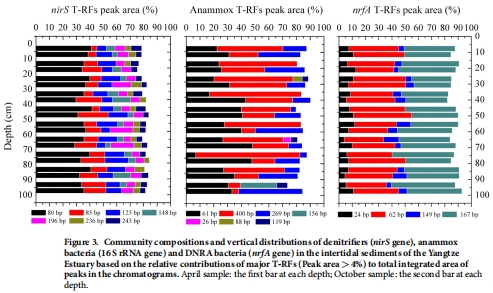 通過高通量測序和末端限制性片段長度多態(tài)性分析(T-RFLP) 研究功能微生物(基于 nirS(反硝化)、16S rRNA(厭氧氨氧化)、nrfA(DNRA)基因)的群落結(jié)構(gòu)和垂直分布(圖3)。