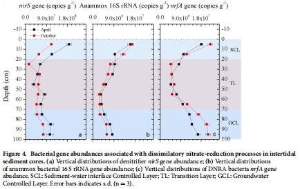 數(shù)據(jù):功能基因(nirS, 厭氧氨氧化菌16S rRNA, nrfA)的豐度垂直分布與對應(yīng)的過程速率(DNF, ANA, DNRA)高度一致,也呈現(xiàn)出雙峰模式。統(tǒng)計顯示,基因豐度與過程速率之間存在顯著正相關(guān)關(guān)系。