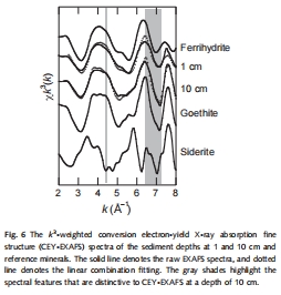 采用表面敏感的轉換電子產額EXAFS 分析顆粒表面的鐵礦物組成,以探測包裹現象(圖6)。