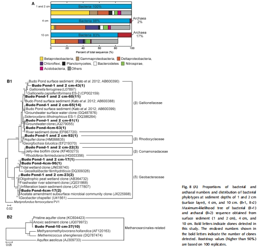 微生物群落分析:通過16S rRNA基因克隆文庫技術,分析不同深度沉積物中的細菌和古菌群落結構,識別與鐵循環相關的關鍵功能菌群(如鐵氧化菌、鐵還原菌、產甲烷菌)(圖8)。