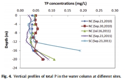 數據:圖2, 3顯示,夏季(4-9月)紅楓水庫存在明顯熱分層(溫躍層約8米深)和氧分層,底層水(>12米)DO濃度接近0 mg/L,形成季節性缺氧。圖4顯示,底層水TP濃度在SWI附近急劇升高,表明沉積物是底層水磷的重要來源。