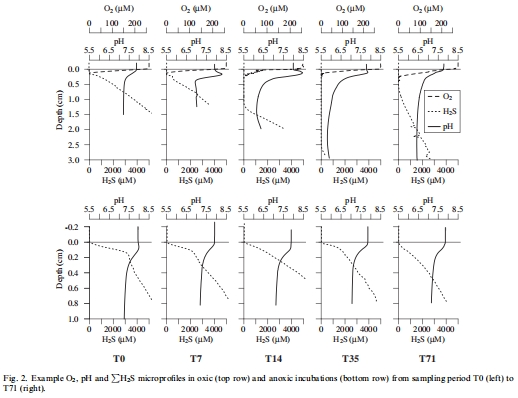 沉積物微環境剖面(O?, pH, H?S)(來自圖2和表1):