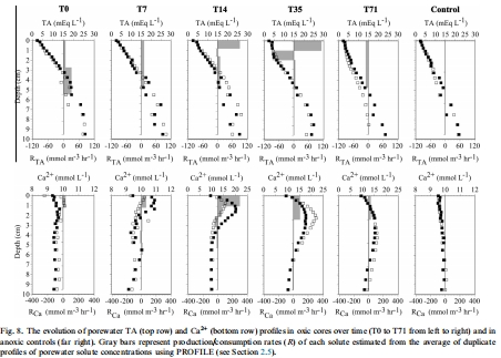 數據:在e-SOx活躍期(T14, T35),孔隙水中Fe2?和Mn2?在亞氧化層(~2-4 cm)出現明顯的濃度峰值。Ca2?濃度在表層附近顯著升高。SO?2?剖面在e-SOx發展后出現分層結構,表層呈現SO?2?的生成,深層則顯示消耗。