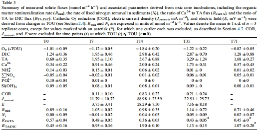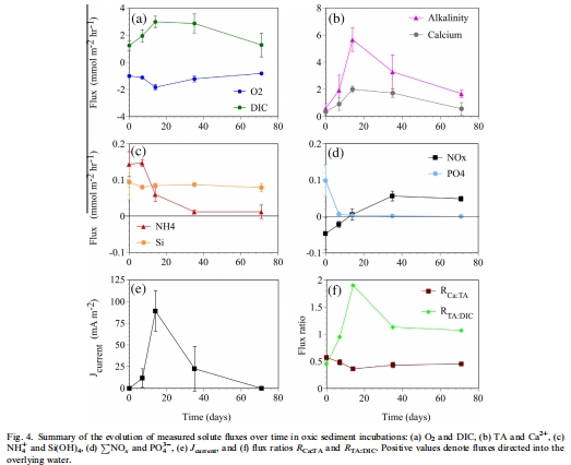 數據:e-SOx活動高峰期(T14),沉積物-水界面的總耗氧量(TOU)、溶解無機碳(DIC)通量、堿度(TA)通量和鈣(Ca2?)通量均達到峰值,較初始值(T0)顯著增加(TOU: +82%, DIC: +140%, TA: +845%, Ca2?: +488%)。相反,磷酸鹽(PO?3?)通量在e-SOx活躍期被有效“封蓋”,降至接近零。銨(NH??)通量隨時間下降,而硝氮(NOx?)通量由流入轉為流出。