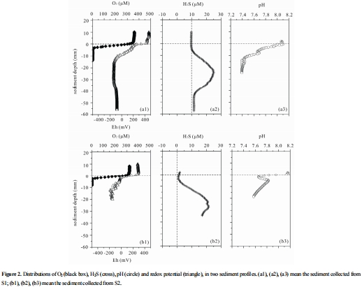 界面過程分帶性:O?在毫米尺度內耗盡,H?S在厘米尺度積累,證實紅楓湖沉積物存在強烈的垂直化學梯度。