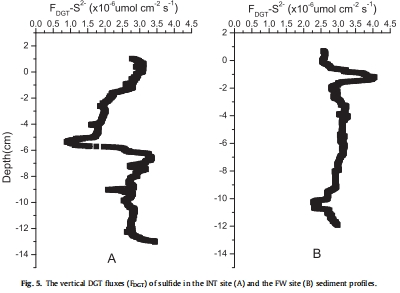硫化物通量(圖5):INT點硫化物通量在~5 cm處出現(xiàn)最低值,隨后升高并保持穩(wěn)定;FW點硫化物通量在0.5-2 cm處出現(xiàn)峰值,隨后下降并趨于穩(wěn)定。