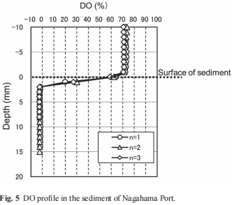 數據:圖5顯示,在沉積物-水界面之下很淺的深度(約2-3毫米),溶解氧(DO)濃度即迅速降至接近零。