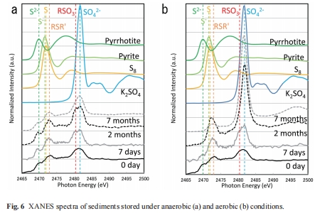 本研究應用基于同步輻射的X射線吸收近邊結構(XANES)光譜學,分析了日本琵琶湖沉積物中硫的化學形態。樣品采集自長浜港,該處常年有泥質物質沉積。XANES分析揭示了多種硫形態的存在,包括還原性無機硫(如FeS, FeS?, 單質S)、還原性有機硫(如蛋氨酸)、中間價態硫(如磺酸鹽)和氧化性硫(如硫酸鹽)。研究發現,將沉積物在有氧條件下儲存七個月后,最強還原性的無機硫幾乎完全消失,而氧化性硫顯著增加。相反,在厭氧條件下,除第一周最強還原性無機硫因可能的生物氧化作用略有減少外,各硫形態的比例基本保持不變。研究證明,XANES不僅是一種非侵入性的、可用于測定沉積物中硫化學形態的方法,還能用于追蹤由固液組成的沉積物的氧化狀態。
