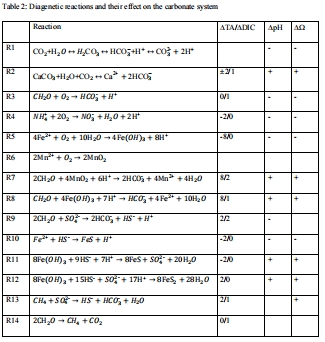 數據整合與建模:結合原位微電極數據(如氧通量計算)和孔隙水化學組成,使用CO2SYS程序計算碳酸鹽物種,并討論早期成巖反應(表2)對Ω的影響。