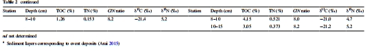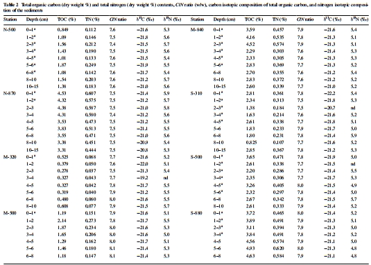 數據:Table 2列出各站點TOC(0.5-5.0%)、TN(0.05-0.6%)、C/N比(7.4-8.2)、δ13C(-22.2‰至-19.2‰)和δ1?N(4.7-5.9‰)。C/N比接近海洋浮游植物值(~6),δ13C與海洋有機質一致。