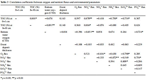 數據:Table 3顯示事件沉積厚度與通量無顯著相關;TOC與NO??通量正相關(r=0.875),與NH??通量負相關;底層水DO與NO??通量負相關。