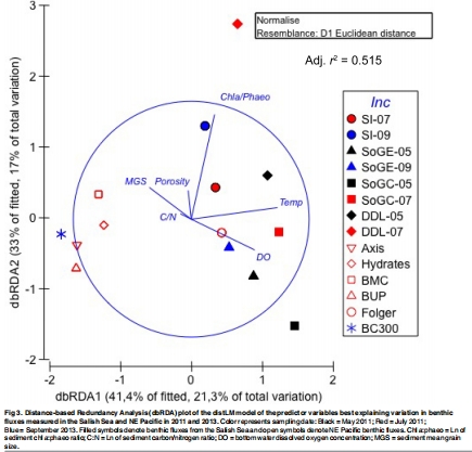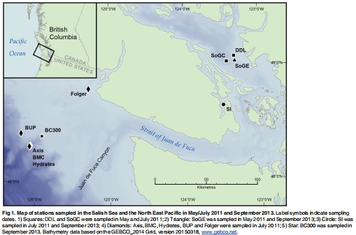 采樣設計:在2011年5月、7月和2013年9月,使用ROV ROPOS在東北太平洋和薩利希海的10個站點采集沉積物巖心(深度范圍96-987米)。站點覆蓋了從缺氧區(OMZ)到富氧水域的自然梯度(Fig 1)。
