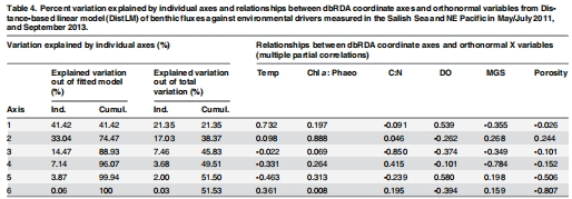 數據:Table 3顯示DistLM模型中,溫度貢獻16.3%通量變異,葉綠素a/褐藻素比11.8%。Table 4和Fig 3的dbRDA圖揭示了溫度和DO是主要驅動因子。