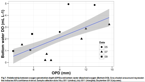 數據:使用Unisense電極測量OPD,范圍3.7–13.0 mm。Fig 7顯示OPD與DO正相關。