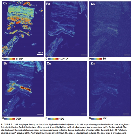 化石記錄應用:金屬分布模式(如球狀體熱點)與太古代疊層石相似,支持金屬作為微生物活動的潛在生物標志物。