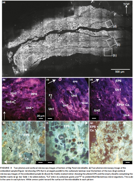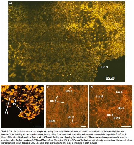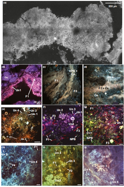 數據描述:圖2-4的CLSM和TPEM圖像顯示微生物多樣性(如藍藻鞘結構)和EPS空間變化;表1總結9種微生物形態類型(如Un1-Un5、F1-F4)。