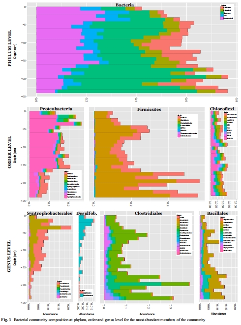 數據:Fig. 3 顯示群落隨深度演變:Proteobacteria在淺層(0.5-3.5厘米)主導,Firmicutes在深層(>16.5厘米)占優(相對豐度達50%)。Fig. 4 揭示Firmicutes亞群中,Clostridium sp.與金屬濃度正相關,而其他類群(如Paenibacillus)與有機碳負相關。