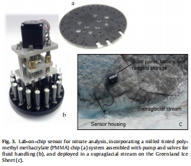 技術(shù)展示:圖3呈現(xiàn)實(shí)驗(yàn)室芯片傳感器在格陵蘭冰面溪流的部署實(shí)例,該傳感器通過(guò)Griess比色法實(shí)現(xiàn)0.02 μM檢測(cè)限。