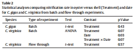 數(shù)據(jù):Fig.1中C. gigas和C. virginica硝化速率無(wú)顯著差異;Table 1顯示樣本殼高和面積匹配,排除尺寸偏差。