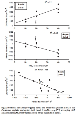 數(shù)據(jù):Fig.2顯示活牡蠣反硝化速率(269±37 nmol N·cm?2·d?1)是空殼(74±17 nmol N·cm?2·d?1)的3.6倍,且與硝酸鹽濃度正相關(guān)。Table 3流式實(shí)驗(yàn)數(shù)據(jù)證實(shí)活牡蠣反硝化占總硝酸鹽吸收的20%。