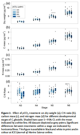 數(shù)據(jù):Figure 2A、2C和2D顯示干重從N3的1.5±0.1 μg/個(gè)體增至N6的7.1±0.2 μg/個(gè)體,碳和氮質(zhì)量同步增加。除N5階段干重在高壓pCO?略低外(p<0.02),其他階段無差異。C:N比(Figure 2B)在N6階段低pCO?處理中略低,但無一致趨勢(shì)。