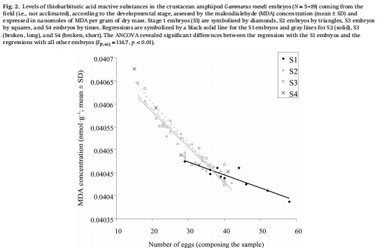 數據:Fig. 2顯示TBARS水平在S1胚胎中較高,但S2–S4無顯著變化;胚胎數量增加時TBARS降低(ANCOVA, p < 0.01)。