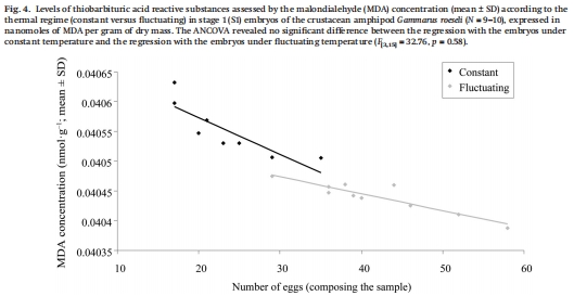 數據:Fig. 4比較CTR與FTR下S1胚胎的TBARS水平,CTR組略高(ANCOVA, p = 0.038),但回歸斜率無差異。