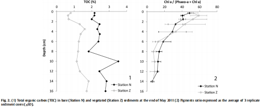 數據:Fig.2顯示有植被站點TOC較低但更均勻;Fig.3顯示夏季pH降低(最低6.2),氧滲透淺(1.8-2.1 mm)。