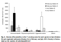 數據:Fig.4顯示有孔蟲總密度在2月有植被站點最高(如站點Z達4350個體/50 cm2),7月無植被站點E. scabra占主導(78-91%)。物種以A. tepida、H. germanica和E. scabra為主。