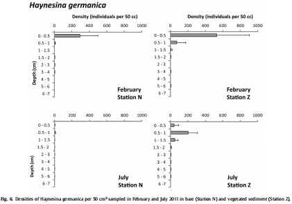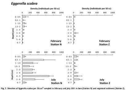 數據:Fig.5和Fig.6顯示鈣質物種(A. tepida和H. germanica)主要集中在沉積物表層(0-0.5 cm),而有植被站點分布略深;Fig.7顯示E. scabra在深層(至7 cm)仍存活。