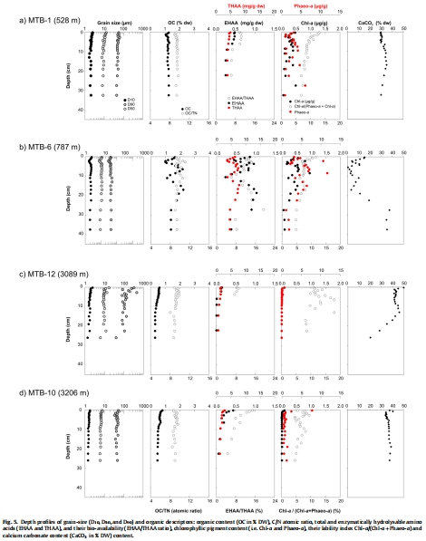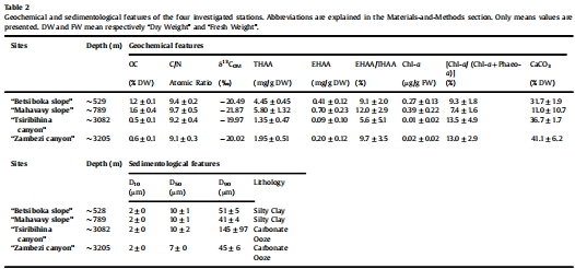 數據:Table 2提供OC含量(上坡站點1.2-1.6% DW,峽谷站點0.5-0.6% DW)、C/N比(~9-10)、δ13COM(-19.97‰至-21.87‰)等;Fig. 5展示有機質垂直剖面,如EHAA/THAA比率(上坡站點~12%,峽谷站點~6%)和葉綠素新鮮度指數。