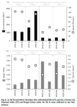數據:Table 3顯示有孔蟲密度最高在Mahavavy斜坡站點(MTB-7B核心,3740個體/100 cm2),最低在Zambezi峽谷站點(MTB-11B核心,268個體/100 cm2);物種豐富度(S)在Betsiboka斜坡站點最高(124種),在Tsiribihina峽谷站點最低(36種)。Fig. 6-a-b通過箱線圖展示密度和多樣性的站點間差異。