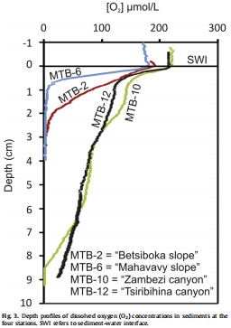數據:Table 1列出底部水氧濃度(BWO),范圍178-219 μmol/L;Fig. 3通過氧剖面顯示氧滲透深度(OPD),上坡站點OPD較淺(Betsiboka斜坡30 mm,Mahavavy斜坡15 mm),峽谷站點OPD深(>80 mm)。