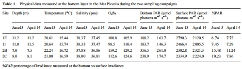 環(huán)境參數(shù)測量:使用Seabird探頭測量水溫、鹽度和溶解氧;PAR傳感器測量光可用性;沉積物粒度分析;污染物(重金屬、PCBs)濃度量化(Table 1)。
