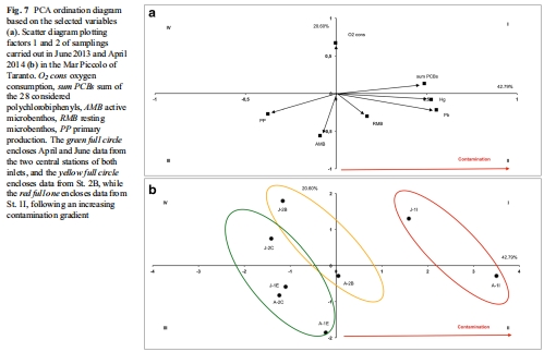 數(shù)據(jù):Fig. 7的PCA圖顯示污染物(如PCBs、Hg)與微生物豐度負相關(guān);St. 1I站點聚集在高污染區(qū)域。