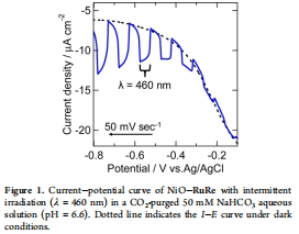 數據來源:圖1顯示NiO-RuRe光陰極在CO2飽和的含水溶液(pH 6.6)中的電流-電位曲線(λ = 460 nm照射);圖5顯示CoOx/TaON光陽極在Ar氛圍含水溶液(pH 8.3)中的電流-電位曲線(λ > 400 nm照射)。