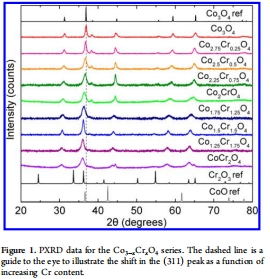 數(shù)據(jù)來源:圖1顯示Co???Cr?O?系列的PXRD圖譜;(311)峰隨Cr含量增加向低角度偏移;表1總結晶格參數(shù)、BET表面積和金屬含量。