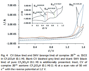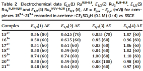 數據來源:圖4展示203?的CV和SQWV曲線;Table 2列出所有配合物的半波電位(E?/?) for RuII,II/RuII,III等氧化過程。