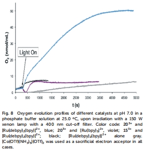 光化學驅動:使用[Ru(bpy)?]2?或[Ru(debpy)?(bpy)]2?為光敏劑,Co(III)為犧牲電子受體,在pH 7.0磷酸緩沖液中通過Clark電極(Unisense)監測光驅動O?生成(圖8)。