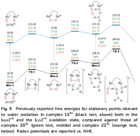 機制統一性:DFT計算支持分子內O-O耦合為水氧化主要路徑,取代基通過影響關鍵中間體(如RuV=O)穩定性調控決速步能壘。