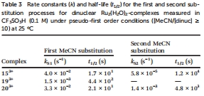 機制與動力學分析:通過取代動力學實驗(測量MeCN配體交換速率,Table 3)和DFT計算(圖9)揭示水氧化路徑(如分子內O-O耦合與親核攻擊機制),并分析取代基對決速步(如氧釋放能壘)的影響。