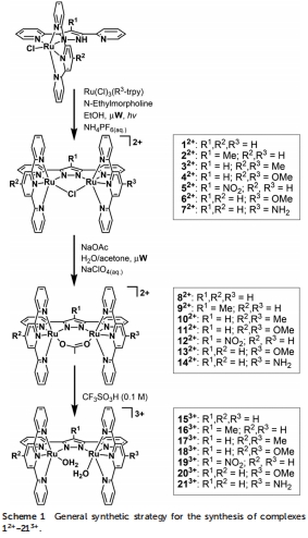 研究意義:電子給體基團降低氧化電位(如203?的E?/?(II,II/II,III)=0.50 V vs. SSCE),吸電子基團升高電位(193?的E?/?=0.74 V),證明取代基可調控熱力學驅動力。電位變化與催化活性相關(低電位配合物更易氧化水),為催化劑篩選提供電化學標準。