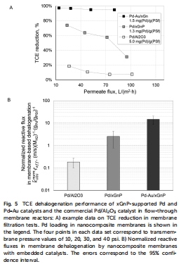 數據來源:圖5A顯示不同壓力下TCE去除率(Pd-Au/xGnP在40 psi時達96%);圖5B對比標準化反應通量(Pd-Au/xGnP: 14.71 m s?1 MH??1 gPd?1 gPSf)。