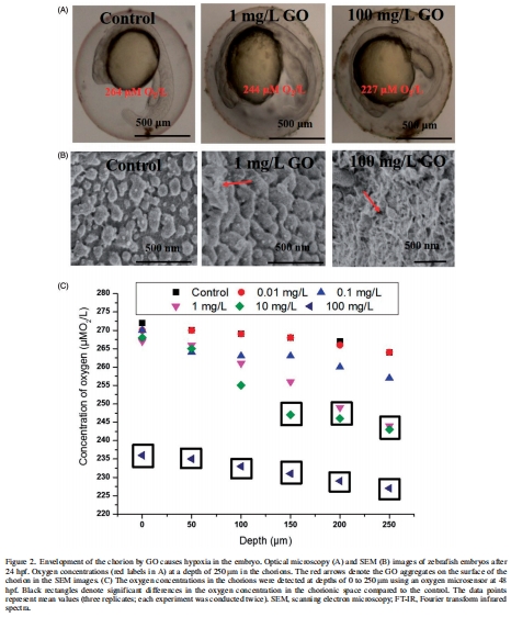 數據來源:Figure 2A-B的SEM圖像顯示GO覆蓋絨毛膜表面并阻塞孔道;Figure 2C通過Unisense電極顯示隨GO濃度增加,胚胎周邊氧濃度顯著下降(100 mg/L時降至227 μM vs. 對照271 μM)。