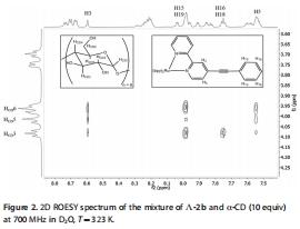 數據來源:Figure 1顯示Λ-2與α-CD混合后的1H NMR譜,H?質子化學位移變化表明手性依賴的包結;Figure 2為Λ-2與α-CD的2D ROESY譜,顯示苯乙炔基質子與CD空腔內質子(HCD?、HCD?)的相關性。
