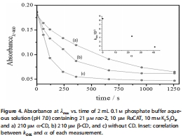 研究意義:添加α-CD后,rac-2的k_obs從8.4×10?3 s?1降至1.8×10?3 s?1,降解減緩約4倍,表明包結部分保護了配合物;β-CD也顯示保護作用(k_obs=4.3×10?3 s?1),但效果較弱,與包結度(α)正相關(Figure 4插圖)。