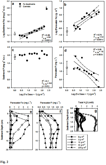 數據來源:圖2a-b顯示鐵添加顯著增加沉積物固相和孔隙水中的鐵濃度(劑量效應R2 > 0.8);圖2c-d表明孔隙水磷濃度隨鐵劑量增加而降低(高劑量時降幅達70%)。