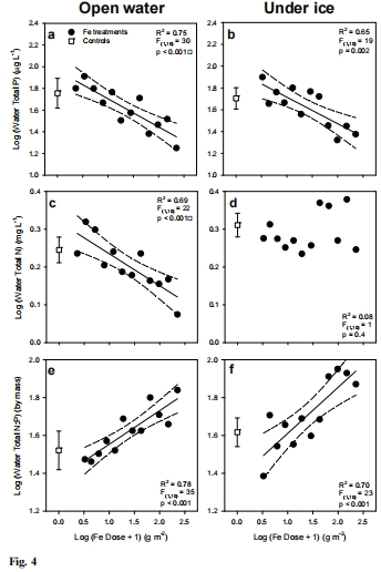 數據來源:圖3a-d顯示對照中宇宙夏季總磷峰值>100 μg L?1,而鐵處理組峰值顯著降低(高劑量時<30 μg L?1);圖4a-b證實鐵劑量與平均總磷濃度負相關(開放水域期R2 = 0.65)。