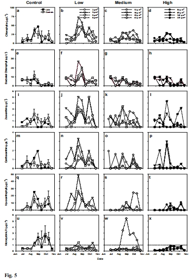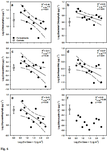 數據來源:圖5a-d中葉綠素a濃度在鐵處理組夏季藻華期降低50%以上;圖6c-e顯示藍藻色素(如玉米黃質、角黃素)隨鐵劑量增加而減少(劑量效應P < 0.05)。