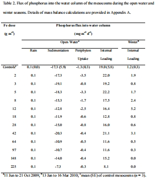 數據來源:表2顯示鐵添加將沉積物磷釋放通量從對照的19 mg P m?2 d?1降至高劑量組的8 mg P m?2 d?1(降幅58%)。